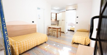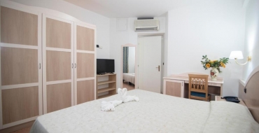 Junior Suite Panoramic in Dependance (piebūvē 8 m no galvenās ēkas, 2. un 3. stāvā bez lifta, king-size gulta (180 cm x 200 cm, savienoti divi vienvietīgi matrači), dīvāngulta, tējas komplekts/ kafijas pagatavošanas iespēja, halāts un čības, mini ledusskapis, terase ar skaistu skatu numuriņos 3. stāvā (nav privāti) ar sauļošanās krēsliem, max 3 cilv. + zīdainis, 33-37 m2);