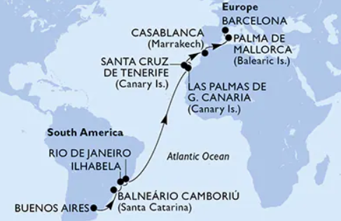 MSC Fantasia — 20 nakšu ceļojums no Argentīnas uz Eiropu